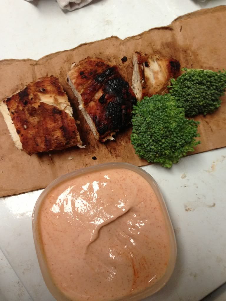 1 chicken breast broccoli more than what's in the pic and Greek yogurt with tapatio as a dip for the broccoli.